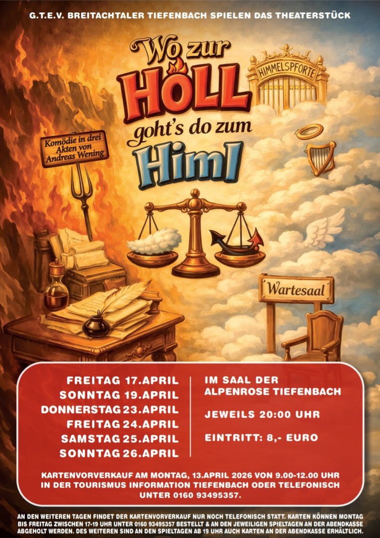 Kartenvorverkauf: Der Kartenvorverkauf beginnt am Montag, 13. April 2026. Von 09:00 – 12:00 Uhr können die Karten in der Tourismus Information Tiefenbach abgeholt oder telefonisch